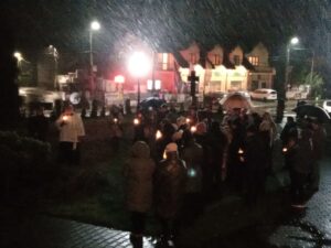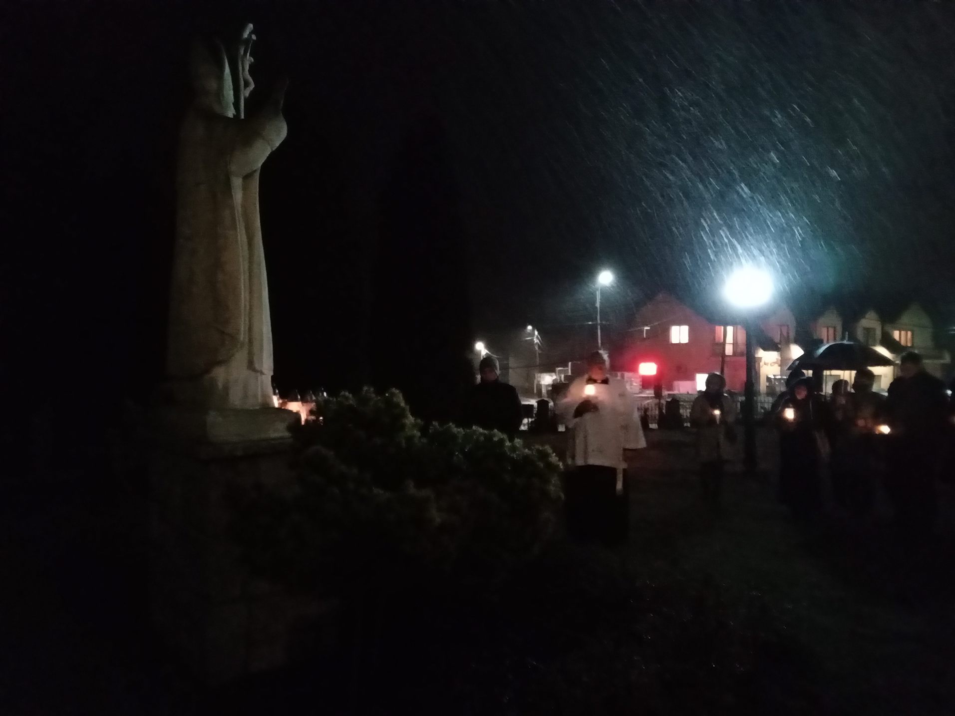 O godz. 20.30 wyjątkowa grupa parafian, którym bliska jest pamięć Św. Jana Pawła II, odmówiła różaniec w intencji parafii i Ojczyzny. Po wysłuchaniu fragmentu kazania naszego Papieża i zaśpiewaniu pieśni Barka, zaświeciliśmy znicze pod Jego pomnikiem obok Kościoła.