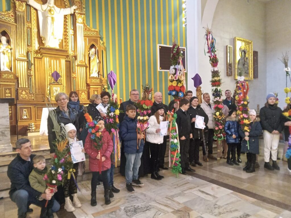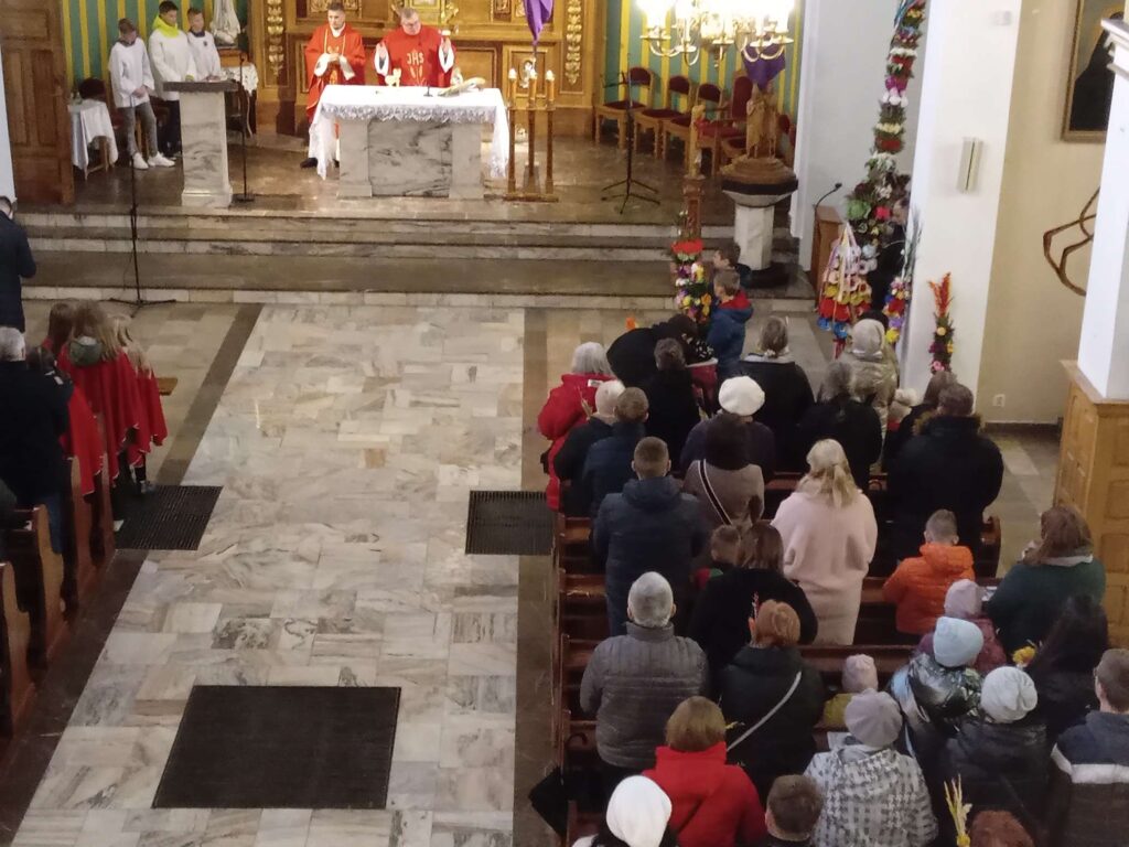 Na Mszy św. gościliśmy scholę dziecięcą z Miechowa prowadzoną przez Grzegorza Sęka. Po Mszy św. ogłoszony został wynik konkursu na najpiękniejszą palmę wielkanocną.
